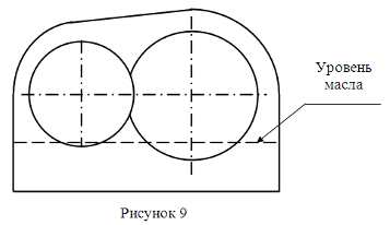В редукторах общего назначения обычно применяется комбинированное смазывание. Одно или несколько зубчатых колёс смазываются погружением в ванну с жидким смазочным материалом в нижней части корпуса редуктора (картере) (рисунок 9), а остальные узлы и детали, в том числе подшипники качения, смазываются за счёт разбрызгивания масла погруженными колёсами и циркуляции внутри корпуса образовавшегося масляного тумана. По времени – это непрерывное смазывание.