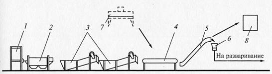 1 - опрокидыватель ящичных поддонов; 2 - моечная машина; 3 - моечная машина унифицированная; 4 - конвейер; 5 - элеватор; 6 - дробилка; 7 - машина для удаления плодоножек; 8 - косточковыбивная машина.