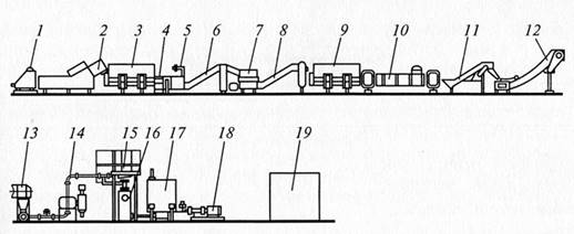 1 - контейнероопрокидыватель; 2 - машина для замочки; 3 - машина для мойки; 4 - стол; 5 - машина для вырезки плодоножки; 6, 8 - конвейеры; 7 - течка; 9 - моечная машина; 10 - конвейер для инспекции и обрезки кабачков; 11 - машина для резки на кружки; 12 - элеватор; 13 - дробилка; 14 - установка для разваривания; 15, 17 - емкости; 16 - протирочная машина; 18 - насос; 19 - пульт управления.