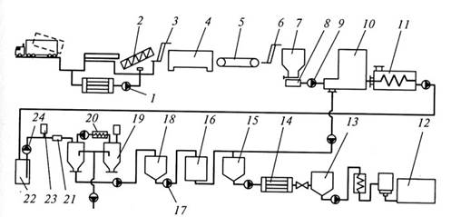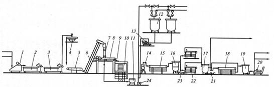 1 - контейнероопрокидыватель; 2, 3 - вентиляторные моечные машины; 4 - машина для удаления плодоножек; 5 - инспекционный конвейер; 6 - элеватор; 7 - дробилка; 8 - стекатель; 9 - дозатор; 10 - гидравлический пресс с насосом; 11 - сборник с фильтром; 12 - сборник-мерник; 13,20 - передвижной насос; 14 - кожухотрубный подогреватель; 15 - узел температурной выдержки; 16 - сборник-смеситель; 17,19 - сосуды; 18 - пастеризатор; 21, 23, 24 - винтовые насосы; 22 - фильтр-пресс.