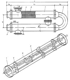 Кожухотрубные теплообменники представляют собой аппараты, выполненные из пучков труб, собранных при помощи трубных решеток, и ограниченные кожухами и крышками со штуцерами. Трубное и межтрубное пространства в аппарате разобщены, а каждое из этих пространств может быть разделено при помощи перегородок на несколько ходов. Перегородки устанавливаются с целью увеличения скорости, следовательно, и интенсивности теплообмена теплоносителей. Горизонтальные секционные скоростные водоподогреватели по ГОСТ 27590 с трубной системой из прямых гладких или профилированных труб отличаются тем, что для устранения прогиба трубок устанавливаются двухсекторные опорные перегородки, представляющие собой часть трубной решетки.