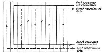 В одноходовых теплообменниках четыре штуцера для подвода и отвода греющей и нагреваемой воды располагаются на одной неподвижной плите.