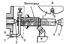Рис.9. Обработка в центрах: 1 — поводковый патрон, 2 — передний центр, 3 — хомутик, 4 — задний патрон, 5 — пиноль задней бабки