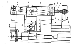 прикрепляемой к станине станка, позволяет получать коническую поверхность с углом при вершине до 40°. Обработка ведется с включением механической подачи.