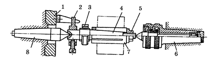 Рис.12. Обработка в центрах: 1 -поводковый патрон, 2 — хомутик, 3 - гайка, 4 -стержень, 5 -гайка, 6 - вращающийся центр, 7 - втулка, 8 - передний центр