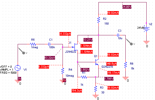 > - 2B. Лучше всего использовать составной элемент из полевого и биполярного транзисторов, что позволит увеличить невысокую крутизну полевого транзистора. Введением отрицательной обратной связи по переменному току мы добьемся температурной стабилизации.