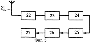 Усиленный сигнал преобразуется модулятором 17 в высокочастотный спектр и пересылается передающей антенной 20 на приемную антенну 21 приемно-регистрирующего элемента (фиг.5).