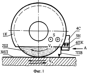 Перед началом работы по измерению шероховатости контрольно - передающий элемент (фиг. 1, 2) в виде сканирующего устройства 4С и каретки 6ПК, установленной на направляющих 5Н с возможностью перемещения вдоль высоты круга, монтируют на кожухе 1К. Для включения в работу сканирующего устройства служит путевой выключатель 7ПВ, выполненный в виде Г-образного рычага. Пока рычаг 7ПВ контактирует с обрабатываемой поверхностью устройство включено и производится измерение, при выходе шлифовального круга из зоны контакта с заготовкой при перебеге устройство выключается.