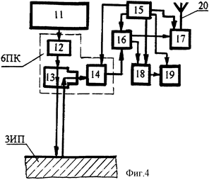 Питание контрольно-передающего элемента (фиг.4) осуществляется при помощи автономного источника питания 15, вмонтированного в сканирующее устройство 4С, закрепленное на кожухе 1К.