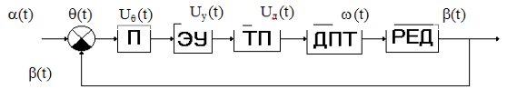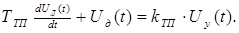 где Ua , Ub – соответственно потенциалы движков потенциометров Пвх и Пвых ; Кe – коэффициент усиления измерительного устройства (потенциометры Пвх и Пвых имеют одинаковые конструкции и параметры). Затем сигнал Ue (t) усиливается по напряжению и мощности соответственно с помощью УТП и ТП. В результате на выходе регулятора формируется управляющее воздействие – напряжение Uд(t) , которое подводится к якорной обмотке двигателя. Значение управляющего напряжения зависит от величины сигнала рассогласования коэффициентов усиления тиристорного преобразователя Кт.п – и усилителя постоянного тока Купт.