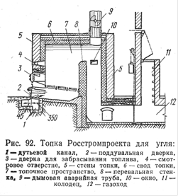 Топки для получения дымовых газов в качестве теплоносителя обычно используют как дополнительный источник тепла к получаемому от кирпичеобжигательных печей. Эти топки получили название подтопков. На рис.92 показана колосниковая топка Росстром-проекта для угля с воздушным и паровым дутьем. Горячие газы из топочного пространства 7 проходят над перевальной стенкой 8