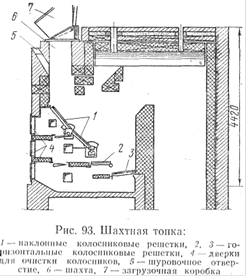 Для сжигания топлива в виде отходов лесопильных и деревоотделочных заводов, влажных дров или торфа применяют шахтную топку (рис.93). Такая топка включает в себя шахту 6