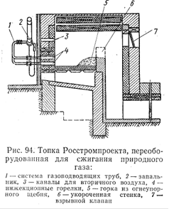 На рис.94 показана типовая топка Росстромпроект а для твердого топлива, приспособленная ДЛЯ сжигания природного газа. В этой топке увеличен топочный объем за счет частичной разборки перевальной стенки и ликвидации камеры для дожигания уносов топлива. Колосниковая решетка и зольник заменены подом из огнеупорного кирпича.