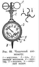 Наиболее часто применяют чашечный анемометр (рис.88), κοτοрый состоит из вертушки, оси 2Гсчетного механизма 3,