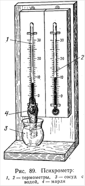 Относительную влажность φ, или степень насыщения, теплоносителя определяют обычно психрометром (рис.89). Он состоит из двух одинаковых термометров 1