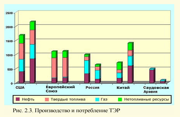 В результате в 1999 г. российский ТЭК отошел на второе место в мире по экспорту топлива (после Саудовской Аравии), на третье место по производству первичных энергоресурсов и на четвертое место по их внутреннему потреблению. Начавшийся подъем экономики сопровождается ростом производства и потребления энергоресурсов, но в обозримой перспективе это не изменит места России в мировой энергетике и ее доли в производстве энергоресурсов, которая сохранится на уровне 10 %.
