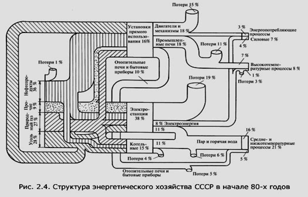 Структура энергетического хозяйства СССР начала 80-х годов показана на рис. 2.4. Почти половина (48 %) потребляемых в стране первичных энергоресурсов тогда поступала непосредственно в технологические и бытовые установки потребителей, из них 18 % расходовалось двигателями и механизмами (все виды транспортных установок, сельскохозяйственная, строительная и военная техника), 19 % шло в промышленные печи (металлургические, цементные и другие обжиговые) и 11 % сжигалось в отопительных печах и бытовых приборах. При этом потребители использовали в виде конечной энергии только четверть первичной энергии, расходуемой двигателями и промышленными печами, и немногим больше половины расхода топлива в быту, а более двух третей непосредственно расходуемых потребителями первичных энергоресурсов шло в потери.