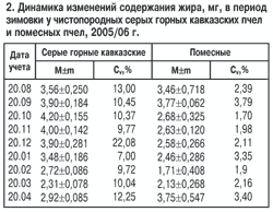 Если сравнить жировой запас в теле чистопородных серых горных кавказских пчел и их помесей (табл.2), то можно заметить явное превосходство первых, хотя и те и другие уходили в зиму примерно с одинаковым количеством жира в теле. Однако у помесных пчел расход его начинался уже в октябре при незначительном похолодании, а у чистопородных - лишь в декабре. Минимальное количество жира в теле помесных пчел зафиксировано в феврале, в этот же период отмечено появление первого расплода в их семьях. В семьях чистопородных пчел развитие начинается только тогда, когда в природе появляется значительное число цветущих медоносных растений.