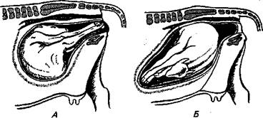 Если из половой щели уже показались передние конечности плода и лежащая на них головка, но дальнейшее продвижение его задерживается, можно натяжением за предлежащие части ускорить выведение плода. Если плод при тазовом предлежании замедленно продвигается, надо спешить с его извлечением, так как продолжительное сдавливание пуповины вызывает смерть плода от асфиксии.