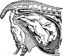 При головном предлежании вначале удаляют одну конечность вместе с лопаткой, затем рассекают ребра и через отверстие извлекают органы грудной полости. После этого разрывают диафрагму, удаляют внутренние органы брюшной полости и извлекают плод.