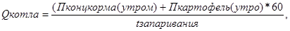 Примерные рационы для откармливаемого молодняка свиней при суточном приросте 600 г и при концентратно-картофельном типе кормления в зимний период, кг на голову в сутки: ячмень — 1,0, горох — 0,3, травяная мука — 0,2, шрот подсолнечный — 0,2, обезжиренное молоко — 0,8, картофель запаренный — 4,0, фосфат обесфторенный — 49 г, соль поваренная -17, премикс (П) 52-1 - 34г. В рационе содержится ЗЭКЕ, 33 МДж обменной энергии, 269 г переваримого протеина, 16,4 г лизина, 546 г клетчатки, 24 г кальция, 20 г фосфора. Потребность в витаминах и микроэлементах обеспечивается премиксом, в 1 кг которого содержится витаминов: А — 300 тыс. ME, D — 50 тыс. ME, Е - 300 мг, В2