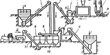 Рисунок 1- Технологическая схема кормоприготовительного цеха КЦС-6000 («Маяк-6»): 1 — питатель концентрированных кормов ПК-6; 2 - транспортер ТС-40С; 3 - измельчитель «Волгарь-5»; 4 - питатель сенной муки ПСМ-10; 5 - дробилка КДУ-2; 6 — транспортер корнеклубнеплодов ТК-5Б; 7- мойка-измельчитель кормов ИКМ-5; 8- шнек ШЗС -40М; 9-запарник-смеситель С12; 10 - шнек IIIBC-40; 11 - выгрузной транспортер ТС-40М: А -концентрированные корма; Б — зеленая масса; В — сено; Г - корнеклубнеплоды, Д — готовая кормосмесь.