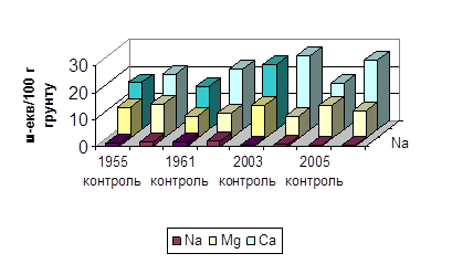 Як видно з графіка (рис.6) за 50 років сільськогосподарського використання солонців каштанових глибоких кількість загальних і токсичних солей у профілі зменшилася у двічі. Це зменшення відбулося передусім за рахунок хлоридів та сульфатів натрію. Натомість у ґрунтах спостерігається тенденція до деякого збільшення кальцію та магнію. Такі зміни у катіонному складі зумовили зростання відношення Сa:Na з 0,2-0,5у 1967 році до 4,0-5,4 у 2003-2005 роках.