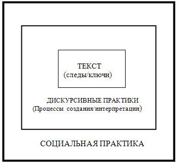 В центре находится текст, содержащий языковые формы (граммемы, слова и т.п.), которые являются "следами" того, как текст был создан (произнесен или написан) и "ключами" к тому, как он может быть интерпретирован (прочтен или услышан). То, как конкретный слушатель/читатель интерпретирует текст, зависит от ресурсов, имеющихся в его/ее распоряжении. Акцент на ресурсах подчеркивает, что тексты сами по себе не содержат фиксированных значений независимо от социального мира, в котором они циркулируют. Значение текста существует как потенциал (meaningpotential); текст получает значение в процессе его интерпретации читателем/слушателем (причем это значение не является одинаковым для всех). Так как текст – это часть дискурсивной деятельности в конкретной ситуации, он находится внутри дискурсивных практик, которые кроме этого включают процессы его создания и интерпретации. Дискурсивные практики являются формой социальной практики, поскольку использование языка – это не индивидуальная деятельность, а социальный акт. Трактовка дискурса как социальной практики предполагает учет более широкого социального контекста или "отношений между текстами, процессами и их социальными условиями – непосредственными условиями ситуативного контекста и более отдаленными условиями институциональных и социальных структур".
