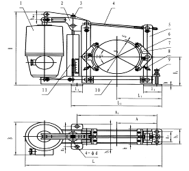 1, 5 – вертикальные рычаги; 2 – скоба; 3 – короткоходовой электромагнит; 4 – якорь; 6 – головка болта; 7, 9 – пружины (основная и вспомогательная); 8 – шток; 10 – основание; 11 – колодки.