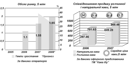 40% зростання у грошовому виразі пояснюється трьома чинниками. Перший — помітний стрибок споживання кави в сегменті HoReCa. За останній рік кавові машини з’явилися практично в кожному маленькому кафе. Другий — зростання популярності кавових «міксів» (напої із серії «три в одному» — з кавою, цукром та різними добавками) і «моно порцій» (розчинна кава у вакуумній упаковці, розрахованій на одну чашку). Українці звикають жити «на ходу», тому цей вид кавових напоїв користується великою популярністю в офісах. До того ж такі напої за смаком стають дедалі більше схожі на натуральну каву — великі виробники не шкодують грошей на нові розробки і просування. Третій чинник зростання — подорожчання кави. За підрахунками українського представника ТМ «Кава illi» Світлани Івахової, у 2007 році натуральна кава збільшилася в ціні на 7%, розчинна — на 11%. У січні — лютому 2008-го кава через високу інфляцію в середньому подорожчала ще на 5%.