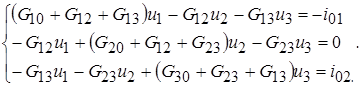 Эта система из трех уравнений разрешима относительно трех искомых узловых напряжений. Когда узловые напряжения будут найдены, по ним вычисляются токи в ветвях и межузловые напряжения с помощью соотношений, приведенных выше.