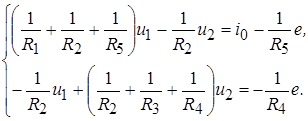 Подставим теперь значения токов в исходную систему уравнений 1, 2, 3. После приведения подобных членов и переноса известных величин в правую часть получим систему уравнений для искомых узловых напряжений или систему узловых уравнений цепи: