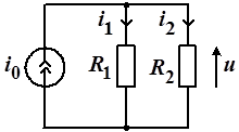 Определим напряжение в цепи и токи в ветвях, если значения сопротивлений резисторов и задающий ток источника известны. Учитывая заданное направление тока и выбранное направления токов и , составляем уравнение по первому закону Кирхгофа: