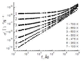 Установлен характер частотной зависимости составляющих электропроводности. На рисунке 2 для примера приведена частотная зависимость действительной компоненты удельной электропроводности (s¢) керамики с х=0.2 при различных температурах.