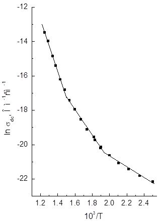 Из анализа приведённых зависимостей s¢ определена удельная электропроводность постоянного тока (sdc) и установлен характер её изменения с температурой. На кривых зависимости ln sdc от обратной температуры (рис. 3) выявляются два излома, которые могут быть связан с фазовыми переходами. Температуры наблюдаемых изломов для исследуемых составов керамики (1-x)KN-xBZN (0.2£х£0.4) слабо зависят от х. Керамика данных твёрдых растворов является высокоомным диэлектриком (при температурах ниже 400 К