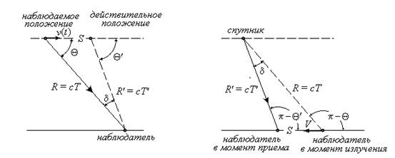 наблюдателем светового импульса, излученного спутником; Q - угол наблюдения, т.е. угол, под которым мы видим спутник; Q - угол, определяющий действительное положение спутника в момент наблюдения; δ – угол между наблюдаемым положением и действительным положением спутника (угол аберрации); v