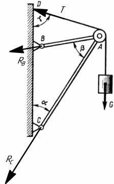 удерживается тросом, перекинутым через блок А, ось которого укреплена на стержнях АВ и АС. Определить силы реакции в стержнях, если углы на рис.8.1 равны, соответственно: α=60º, β=15º, γ=30º. Рисунок не выдержан в масштабе.