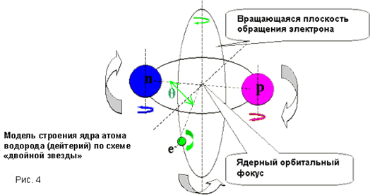 Аналогично формируется динамическое равновесие менее энергоемких орбитальных структур электронных оболочек. На каждом уровне энергии адронов ядра фокусам их ядерных оболочек соответствуют фокусы электронных оболочек, причем их взаимное расположение в пространстве строго фиксировано в пределах равновесного состояния (на схеме ядра атома водорода указан как угол Θ