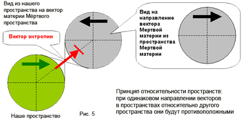 В этом убедиться легко и просто: изготовьте из кальки или жесткой пленки два полупрозрачных диска, на которые нанесите стрелки в одном направлении. Пометьте один диск «наше пространство», а другой - «мертвое». Наколите по центру их на ось так, чтобы ось была со стороны, где нет стрелки. Накалывая диски вы обратите внимание, что на обоих стрелки смотрели в одну сторону. Но когда вы наколете диски, и получите подобие катушки на одной оси, то посмотрите со стороны любого диска на противоположный, – стрелки будут смотреть в разные стороны.