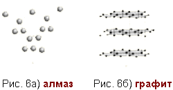 . В алмазе каждый атом углерода имеет 4 тетраэдрически расположенных соседа, образуя кубическую структуру (рис. 6,а). Такая структура отвечает максимальной ковалентности связи, и все 4 электрона каждого атома углерода образуют высокопрочные связи С–С, т.е. в структуре отсутствуют электроны проводимости. Поэтому алмаз отличается отсутствием проводимости, низкой теплопроводностью, высокой твердостью; он самый твердый из известных веществ (рис. 2). На разрыв связи С–С (длина связи 1,54 Å, отсюда ковалентный радиус 1,54/2 = 0,77 Å) в тетраэдрической структуре требуются большие затраты энергии, поэтому алмаз, наряду с исключительной твердостью, характеризуется высокой температурой плавления (3550°C).