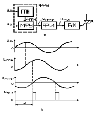 Описать работу СИФУ с горизонтальным способом регулирования угла управления (варианты 1, 2, 6, 8, 0 (последняя цифра № зачетной книжки), или с вертикальным способом регулирования угла управления (варианты 3, 4, 5, 7, 9 (последняя цифра № зачетной книжки). Описать назначение каждого блока системы управления и принцип СИФУ работы в целом.