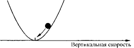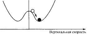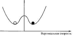 Рис. 15. Данная схема соответствует состоянию равновесия слабо подогреваемой снизу жидкости. По горизонтали откладываются значения вертикальной скорости движения жидкости; шар, положение которого символизирует скорость, всегда возвращается в состояние покоя