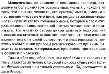 Из признания биологических и социальных различий между людьми и их неповторимости проистекают два принципиальных подхода к пониманию целостности человеческой природы: дуалистический и монистический.