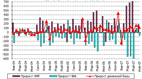 Поскольку согласно этому прогнозу, прирост валютных резервов сокращается, уменьшается необходимость в профиците бюджета, соответственно, уменьшается прирост денежных остатков на счетах Правительства в ЦБ. Однако о чистом кредитовании правительства Центральным банком речь не идет. Задолженность ЦБ перед коммерческими банками качественно снижается и расширяется кредит, предоставляемый коммерческим банкам, который становится основным каналом денежного предложения ЦБ. В то же время, общий объем денежного предложения снижается, что трудно объяснимо в условиях растущей экономики и хотя бы умеренной инфляции.