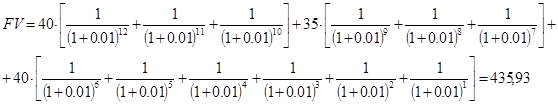 = [(1+ 0,01)11 + (1+0,01)10 +(1+1,01)9] + [(1+0,01)8 + (1+0,01)7 + (1+0,01)6] + [(1+0,01)5 + (1+0,01)4 + (1+0,01)3 + (1+0,01)2 + (1+0,01)1 + (1+0,01)0] = 452,2 д.е.