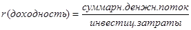 Доходность (r) определяется как отношение суммарного денежного потока от инвестиционного объекта к инвестиционным затратам.