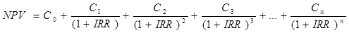 Внутренняя норма доходности (IRR). Представляет собой расчетную ставку дисконтирования, при которой чистая приведенная прибыль стоимость проекта равна нулю. Внутренняя норма доходности находится путем решения следующего уравнения: