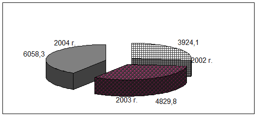 Данные таблицы позволяют наглядно изобразить основные экономические показатели. Товарооборот за 2002-2003 годы изменялся положительными темпами. В 2003 году темп роста составил 25,6% ((4829,8/3924,1) ´100% -100%). В 2004 году по сравнению с 2003 годом темп роста составил 25, 4%, то есть имеет место стабильный рост товарооборота от года к году. По сравнению с 2002 годом рост товарооборота составил 54%, то есть предприятие увеличило товарооборот больше чем в половину. Рассмотрим на диаграмме изменения в товарообороте за эти годы (рис.2.2).