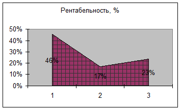 Рентабельность торговой деятельности показывает, насколько предприятия окупает вложенные средства путем получения прибыли. Рентабельность торговой деятельности предприятия в 2002 году составляла 46%, а в 2003 году только 17%. В 2004 году показатель рентабельности вырос на 5% по сравнению с 2003 годом, однако все также его уровень почти в 2 раза ниже, чем в 2002 году. Предприятие нуждается и в дальнейшем снижении издержек и повышении доли прибыли, либо за счет изменения цен закупки, поиска новых партнеров, либо за счет изменения структуры торговой деятельности. Рассмотрим рентабельность в виде диаграммы за ряд анализируемых периодов (рис.2.5).