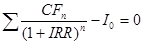 Левая часть уравнения представляет собой дисконтированную стоимость первоначальных затрат, начиная с года инвестирования и заканчивая последним годом использования инвестиционного проекта. Аналогично этому правая часть уравнения представляет собой стоимость всех доходов за тот же период.